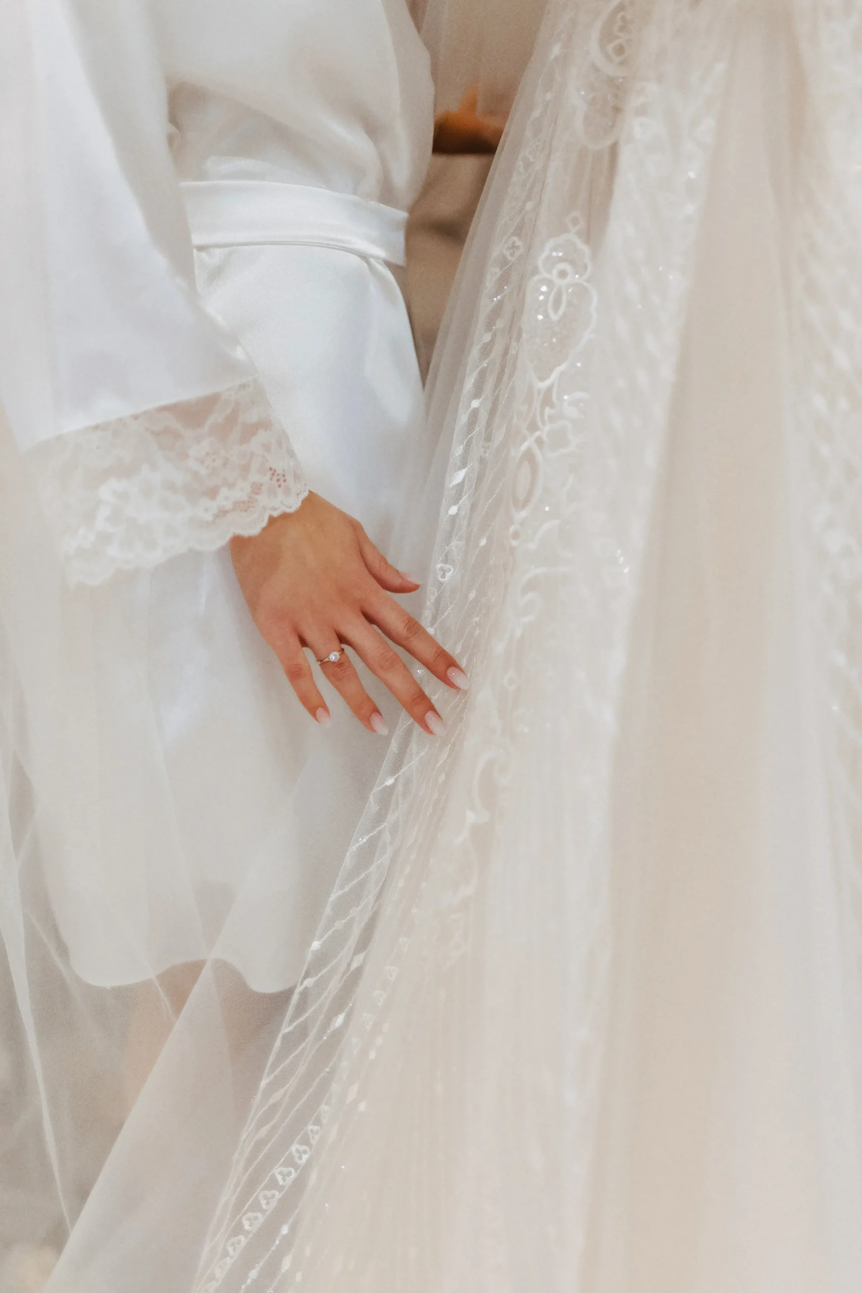 Descripción: Para un toque de elegancia y versatilidad, añade una capa desmontable a cualquier estilo de vestido. Esto es especialmente útil para ceremonias al aire libre.